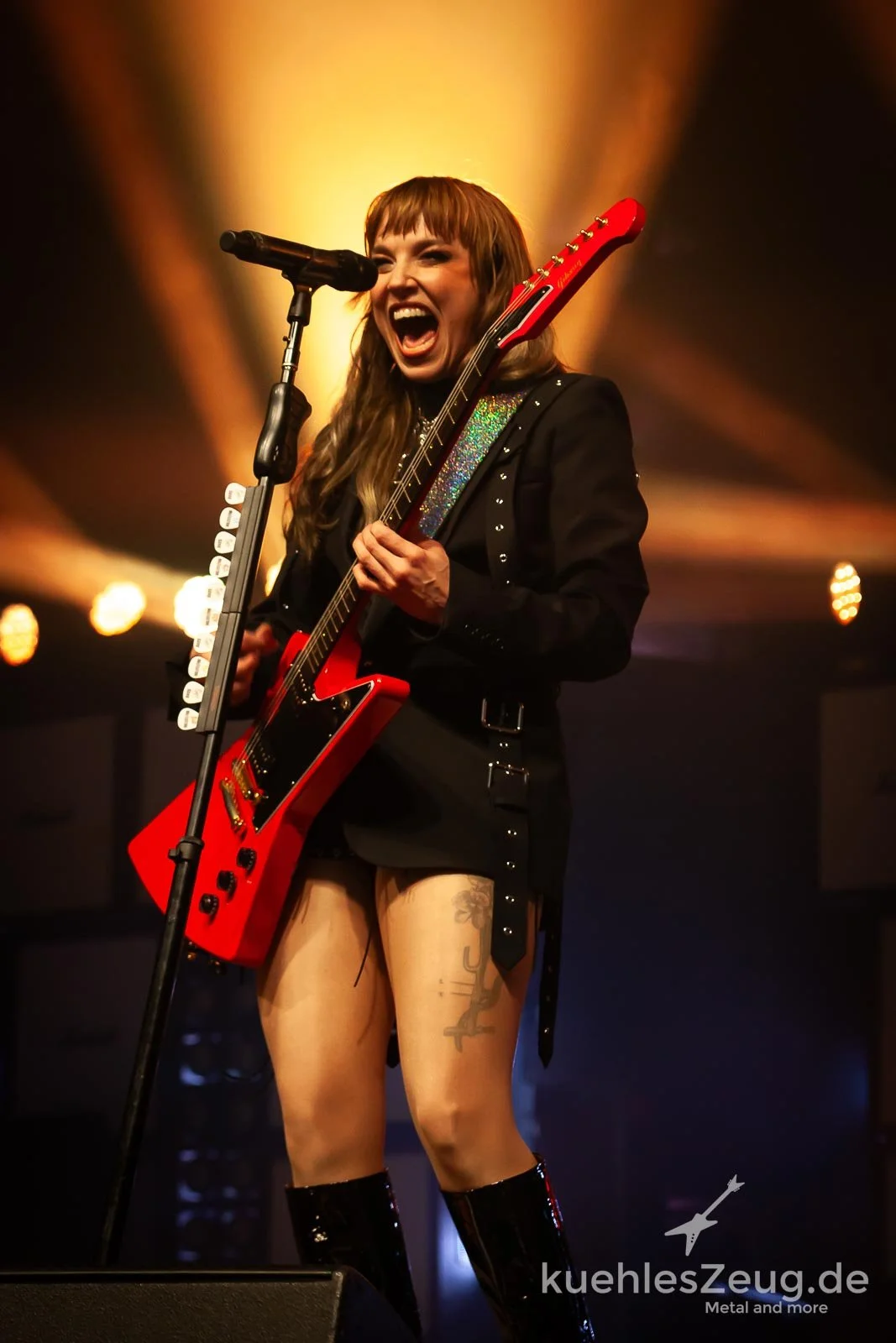 Flugs schreitet man zum Umbau, der von einem wallenden Vorhang verborgen wird – wir können schon mal dahinter spitzen und machen ganz klassische Marshall-Türme aus. So muss das sein beim kernigen Rock der Marke Halestorm, der nun bevorsteht. Wir sinnieren noch kurz über das Motto der Gastspielreise, die ganz gemäß dem aktuellen Langdreher „The nEverest.Tour“ lautet – ein feines Wortspiel, demzufolge man zwar unterwegs zum titelgebenden Dach der Welt, aber nie am Ziel ist und damit niemals ruhen darf. Ganz nebenbei geben wir amüsiert eine zutiefst wahre Anekdote zum Besten: in einer weidlich bekannten Ausfrage-Sendung, die bisweilen Millionäre hervorbringt, lautete die allererste finale Frage seinerzeit, mit wem denn der Abenteuer Edmund Hillary eben jenen Mount Everest 1953 als erster Mensch bestiegen habe. Als die Angetraute einem meiner Weggefährten begeistert die – seinerzeit übrigens richtig vom Kandidaten gelieferte – Lösung berichten wollte, nuschelte der von einem Kneipenausflug leicht Angesäuselte nur: „Sdoch klar. Tenzing Norgay.“ Kann man wohl nur in dem Zustand so virtuos aussprechen. Mit diesem Wissen beseelt, harren wir der Dinge, die sich da hinter dem Vorhang zusammenbrauen, bevor dann um 21.14 (so viel Zeit muss sein) die wilde Sause losgeht. Das Bühnenbild ist mehr aufgeräumt, hinten thront erhöht Bandmitgründer Arejay Hale, heute ganz ohne Farbe im Haar und auf der Joppe, sondern eher funktional gekleidet. Zu den ersten Takten von „Fallen Star“ versieht Joe Hottinger (schon wieder so ein kühler Name!) links den Dienst an der Flying V, rechts bearbeitet Josh Smith den Tieftöner – aber natürlich sind wir alle gespannt, wie sich die Geschäftsführerin selbst in Szene setzen wird. Das tut die gute Lzzy natürlich auch heute wieder mehr als gekonnt, beim ersten teilweise noch bedächtigen Song dominiert der melodischen Klargesagt, die Riffs und Hooks kommen glasklar – aber bei der zweiten Nummer „Watch Out!“ (ebenfalls vom aktuellen Album) kredenzt uns Lzzy dann eine Kostprobe der gesamten, erstaunlichen stimmlichen Bandbreite, die auch treffsicher in aggressive Regionen schweift. Kleidungstechnisch trägt die Dame heute einen militaristisch anmutenden Mantel – und ein Beinkleid, was in der Kürze die Bezeichnung Hose kaum verdient. Aber sie kanns tragen, daher wollen wir da mal keinen Protest einlegen. Leicht ins Schleudern kommen wir allerdings mit unserem Zettelwerk, denn im Hause Halestorm schreibt man Abwechslungsreichtum groß: um einen festen Kern, der auch selbst jeweils neu angeordnet wird, rotieren immer wieder andere Songs in der Setlist. Deshalb kommen wir jetzt in den Genuss von „Back From The Dead“ und einem ebenfalls durchaus heftigen „Mz. Hyde“ – ein Auftakt nach Maß, der in durchaus sauberem Klangteppich erst einmal vornehmlich die ruppige Seite der Kombo auspackt.