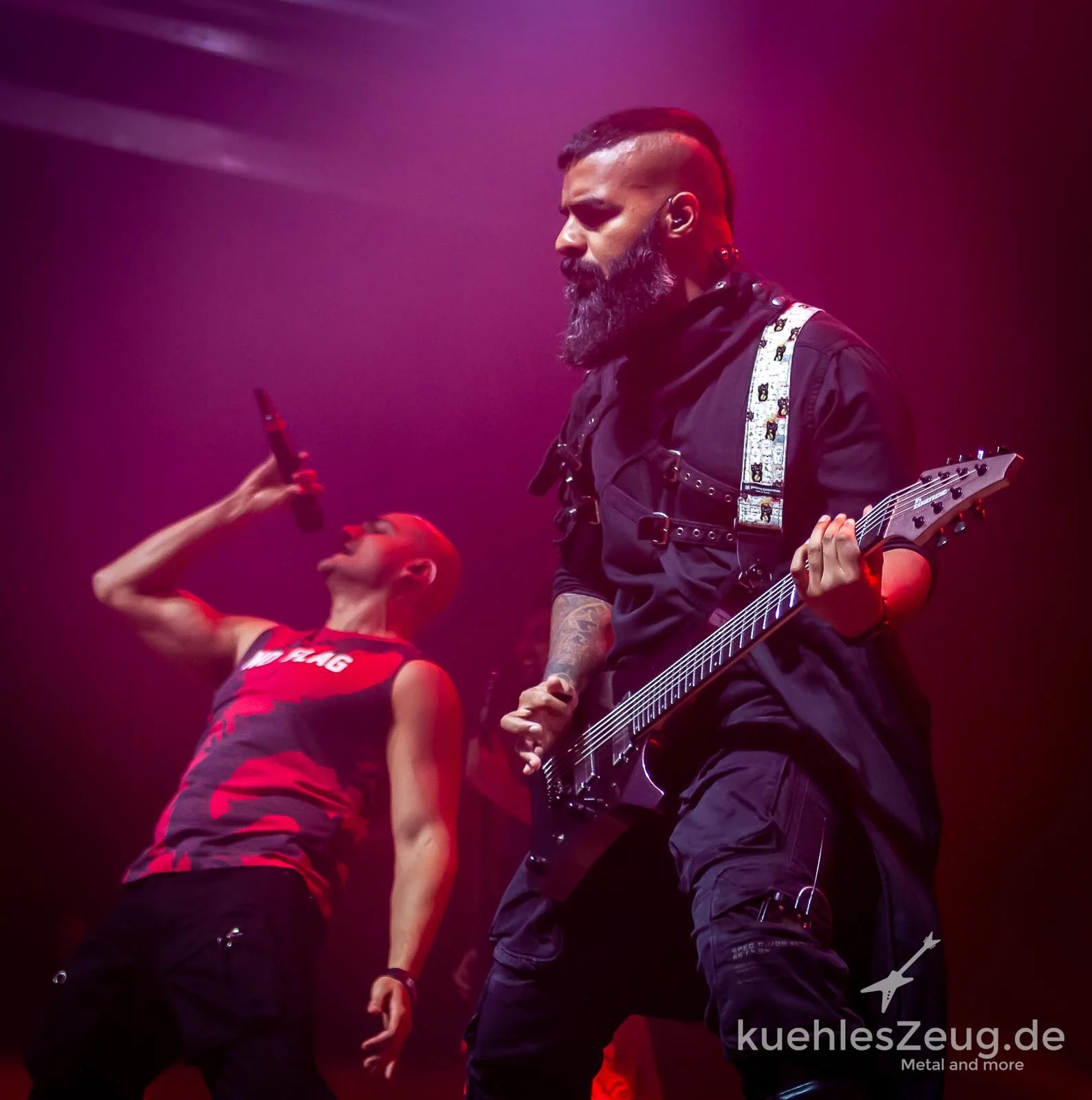 Mit einem für das Grande Furioso schon fast niedlichen Schlagzeug zimmert Vishes Singh einen massiven Klangteppich, auf den Saitenbieger Karan Katiyar (der einmal auch zur Flöte greift) seine Messerriffs legt, zu denen Impresario Jayant Bhadula im blauen Wallegewand seine Growls abfahren lässt. Nicht minder energetisch legt sich dabei der für den Rap zuständige Raoul Kerr ins Zeug, der mit „No Flag“-Shirt offenbar eine Zweitkarriere als Personal Trainer verfolgt. Mit Nummern wie „Gaddaar“ und „Aaj“ nimmt die Chose ihren wilden Ausgang, im Publikum, wo nicht wenige Bandshirts zu erspähen sind, kommt alsbald auch unser alter Bekannter Herr Movement vorbei. Schuhtechnisch ist auf der Bühne alles geboten, von schweren Stiefeln über Crocs bis gar nichts liegt das Spektrum. Bei der Baby-Metal-Kooperation „Bekhauf“ kommen die Stimmen der spaßigen Damen vom Band, Meister Kerr bringt die Botschaft der gerne sozialkritischen, immer engagierten Nummern mit Gusto rüber: als man uns mit „Nu Delhi“ in die Heimat einlädt, warnt er eindrücklich: „It has a great heart, but fuck around, and you will be found…“ Das beherzigen wird doch gerne. Zu „Halla Bol“ animiert uns Herr Bhadula erfolgreich, uns doch auf dem Boden niederzulassen und dann wie an der Schnur gezogen hochzuhüpfen – machen wir. Die permanenten Aufforderungen, den Pit zu eröffnen, befolgen die Schlachtenbummler ebenfalls, bevor dann bei „Machi Bhasad“ (auf gut Englisch bei dem durchaus politischen „Expect a Riot“) ganz und gar die sprichwörtliche Post abgeht. Nach gut 40 Minuten ist der Sturm vorüber, das war durchaus mitreißend und energiegeladen – so macht Cardio doch wahre Freude.